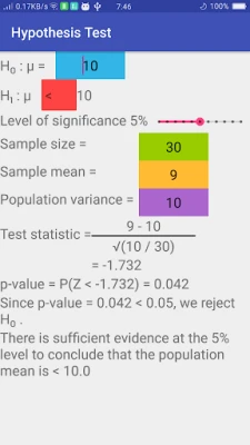 This app shows you how to carry out a 1-sample Z Test. You can specify any sample size, sample mean, population variance and level of significance. It shows all the steps in detail and writes out the conclusion of the test. Free and with no ads. Can be run offline.