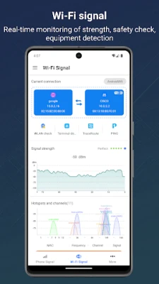 2.WIFI signal monitoring: Real-time detection of signal strength, display of key information such as MAC, channel, IP, rate, etc., detection of security, and listing of connected devices to help you easily manage the network.