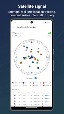3. Satellite signal: real-time tracking of satellite signals, obtaining satellite information, including nationality name (US GPS, China Beidou, EU Galileo, Russia GLONASS, Japan Quasi-Zenith Satellite System, India IRNSS), number of satellites, real-time satellite location, availability, longitude and latitude, address and other information.