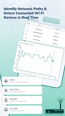 • Wi-Fi Signal:Detect and analyze Wi-Fi signal strength with nearby Wi-Fi details. Trace your connected Wi-Fi network, run a ping test, and see connected devices.