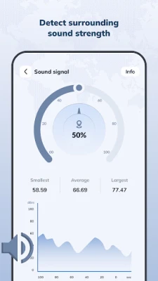 • Sound Signal:Monitor the ambient Sound signal strength with a graph displaying minimum, average, and maximum levels. From this user can get idea about noise level surroundings & also get some information about how to protect your hearing.